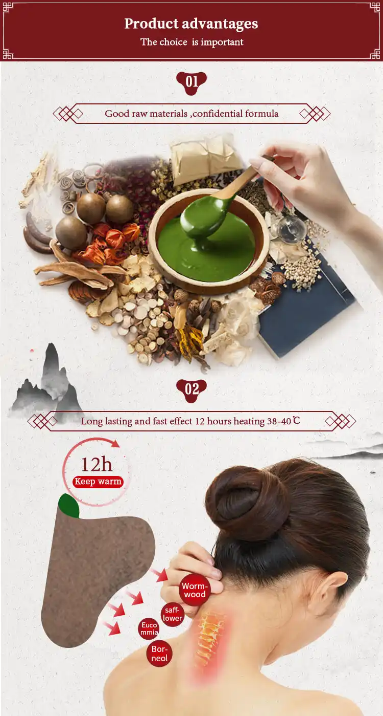 ملكنا رقعة لتخفيف آلام الفقرات العنقية تم تصميمه خصيصًا لتخفيف الانزعاج والتوتر في الرقبة والعمود الفقري العنقي . مشبع بمزيج من المكونات العشبية الطبيعية و العلاج الحراري المهدئ يساعد على تقليل الالتهاب وتحسين الدورة الدموية واسترخاء العضلات المشدودة. تصميم لطيف على البشرة وجيد التهوية يضمن ملاءمة مريحة، ويوفر راحة طويلة الأمد لمدة تصل إلى 12 ساعة . مثالي لآلام الرقبة وتيبسها وتوترها.